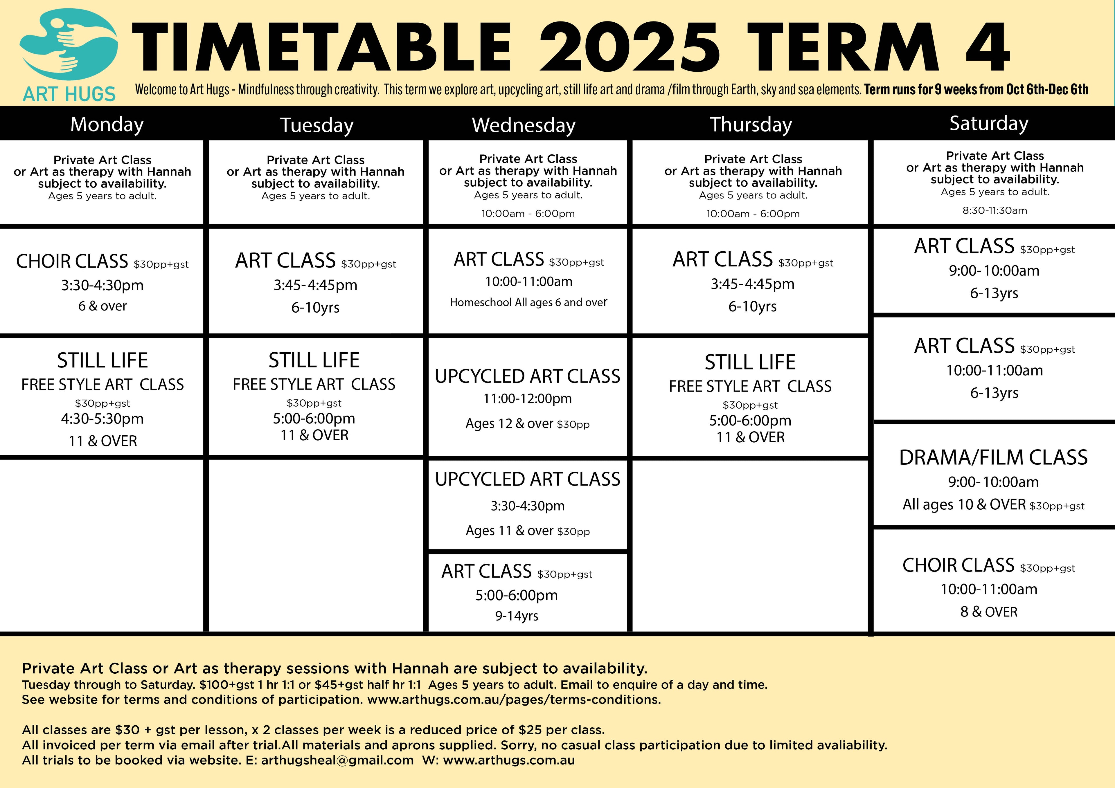 Our classes fill up quickly, so please secure your spot ASAP. All classes are subject to availability, either book on our website, send us a message through our email arthugsheal@gmail.com or through Facebook to check availability and lock in your spot.